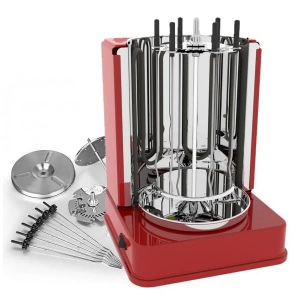 Döner & Dreh Grill Badajoz mit Zubehör Gewicht : 3,5 kg Leistung in Watt: 1400W Zubehör: Gerät mit sechs drehenden Spießen, Mittelspieß, Ölauffangschale, Drehwelle Kabellänge: 0,9m Funktionen : grillen von Kebab, ganzes Hähnchen….. Digital/LED-Anzeige : NEIN Timer : NEIN Ein/Aus-Schalter: Ja Kontrollleuchte : Ja Max. einzufüllende Fleischmenge: 3.0 kg Material des Außengehäuses: Metall Farbe: rot